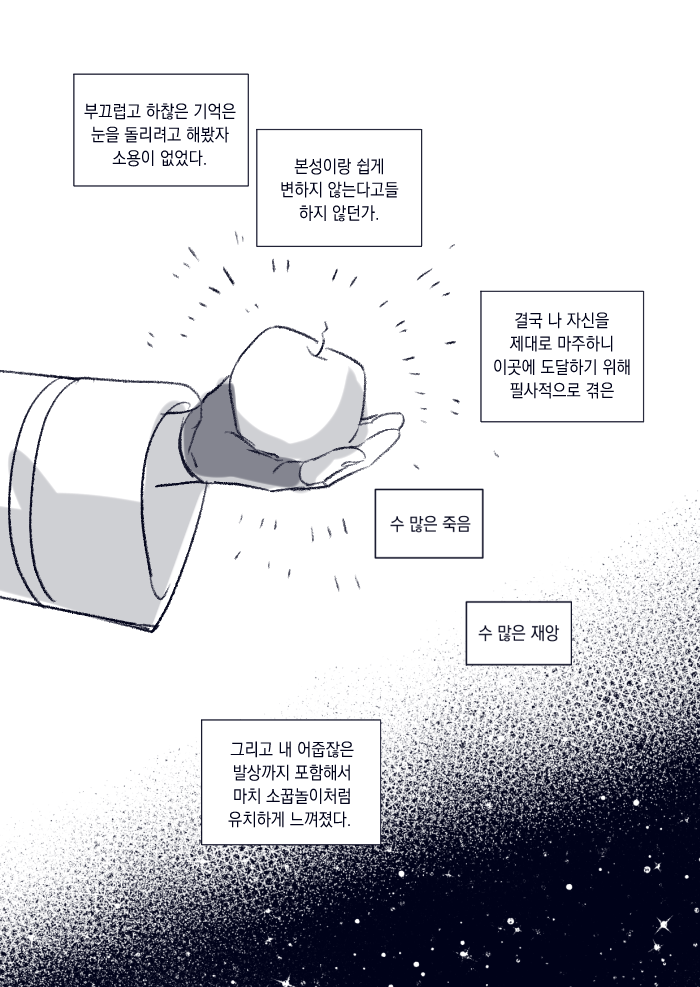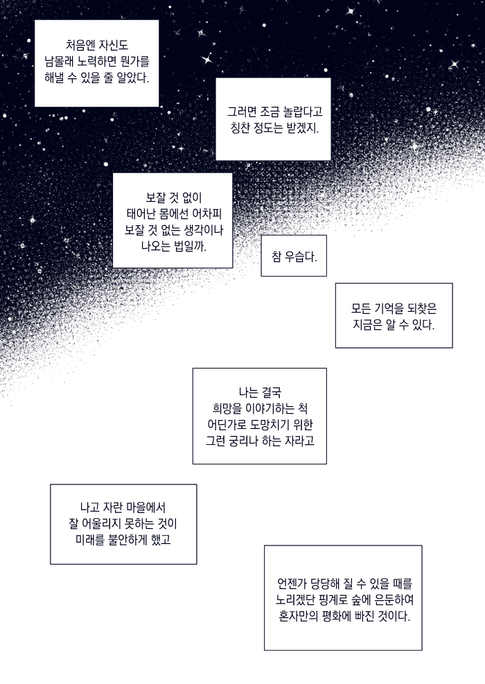물론 마을에 막 도착한 뒤에는 잠만 자고 멍하니 보낸 것 같다. 죽음을 이겨낸 몸이라도 잠시 쉬어야 합니다. 나는 내가 겪고 있는 일을 아무에게도 말하지 않았다. 못한다고 해야하나.. 설명하기도 힘들고. 예. 제가 감히 책임질 수 있는 일이 아닙니다.