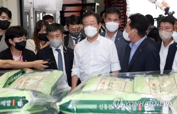 이재명 더불어민주당 대표가 지난해 9월 전북 김제시 김제농협미곡창고에서 백미를 점검하고 있다. (사진=연합뉴스)