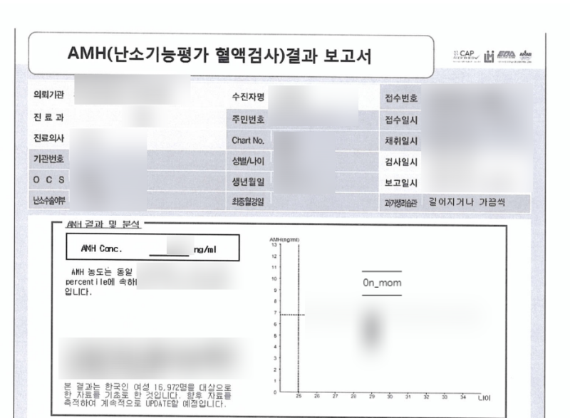 갑상선 호르몬은 우리 몸의 전반적인 신진대사를 조절하는 역할을 하는데 대부분의 호르몬은 갑상선을 통과하기 때문에 굉장히 중요한데 임신을 하게 되면 호르몬 대사량이 증가하는데 그 전에 호르몬 문제가 있으면 임신 전 치료를 통해서 발달에 문제가 없도록 조절해야 하는 태아뿐만 아니라 어머니 건강을 위해서 검사도 필요합니다.갑상선 호르몬은 대표적으로 3가지 검사가 있는데 T3(트리오도티로닌) TSH(갑상선 자극 호르몬) free T4(테트라요도티로닌) 정상 수치는 위 사진을 참고하시면 되는데 특히 중요한 호르몬은 free T4입니다 태아는 12주 전에는 이 T4 호르몬을 스스로 만들지 못하고 그 전까지는 어머니의 호르몬에 의존하게 되는데 뇌 발달에 굉장히 중요한 역할을 합니다 어머니의 T4가 괜찮은지 미리 확인해 보는 것이 좋겠습니까?AMH 검사 Antimullerian hormone 난소 내 검사다음은 매우 충격적이었던 난소 검사입니다.임신을 위해서는 난소에서 배출되는 난자가 꼭 필요한데 여성이 살면서 배출할 수 있는 난자의 수는 정해져 있는데 배란이 다 끝나면 폐경이 됩니다 나이가 들면서 어쩔 수 없이 갯수가 줄어드는데 지금 임신 준비 중인 난자는 얼마나 남았는지, 언제부터 급격히 감소하는지를 이 검사를 통해 알 수 있습니다.그래프가 급격히 떨어지는 구간의 나이를 초과하게 되면 임신 확률도 떨어지게 됩니다.35세부터 고령 산모라고 하는데 저는 충격적으로 32세부터 그래프가 급격히 내려갑니다.32살이 되기 전에 꼭 성공해야 해요!임신 가능성도 퍼센티지로 나오는데 정말 낮을 확률(눈물)인데 보통 이만큼 나온대요.놀라지 마세요!연령에 따른 AMH 농도를 측정하여 평균값과 비교하는데 상위, 하위로 나뉩니다.저의 경우, 또래 평균에 비해 상당히 떨어지는 수치였습니다. 34살의 평균 농도는… 아직 20대인데.. 방심하고 있었습니다.사람마다 예상 연령이 다르기 때문에 젊다고 안심해서는 안 된다고 생각합니다. 이 검사는 불임치료센터나 폐경을 조사하기 위해서도 자주 실시되는 검사입니다. 만약 아이가 찾아오지 않을 때 이유를 찾기 위해서도 중요한 검사입니다.이번 포스팅은 신혼부부의 산전검사 중 갑상선호르몬검사와 난소나이검사의 결과와 중요한 이유에 대해 알아봤습니다 정말 임신을 위해서 많은 공부가 필요하다고 생각합니다.필수검사만 했는데 이렇게 많은 것들이 있다니!! 하지만 스트레스를 받지 않아요! 오히려 새로운 취미가 생긴것 같은 즐거운 기분입니다. 새로운 생명.. 생각만해도 긴장되네요 조금씩 준비해가면 우리에게도 새로운 가족이 생기겠죠?그럼 다음에도 즐거운 정보로 찾아뵐게요 그동안 예뻤으니까요:)