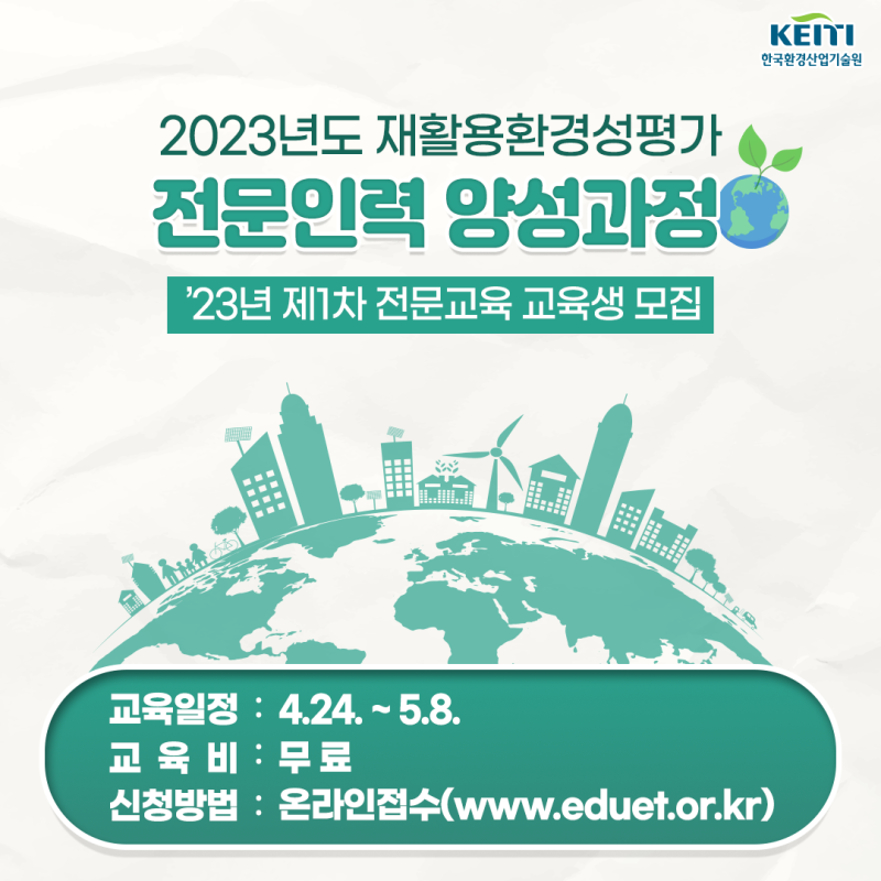 KEITI 한국환경산업기술원 환경기술전문인력양성기관 교육중 23-1차 환경안전보건전문인력양성과정 교육신청 : 2023-03-01 ~ 2023-04-02 교육기간 : 2023-07-04 신청 화면바로가기 과정마감 23-1차 재활용환경평가 전문인력양성과정 교육신청 : 2023-03-15 ~ 2023-04-24 ~ 2023-05 -08 신청 화면바로가기 과정마감 2023년 재활용환경성평가 일반교육신청 : 2023-04 – 123 -031 … www.eduet.or.kr