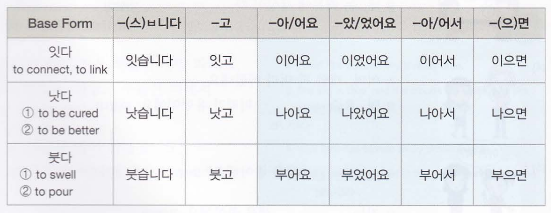 ㅅ으로 끝나는 몇몇 동사와 형용사의 경우 모음으로 시작하는 어미에 ㅅ을 붙이면 생략된다.